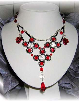 40 jaar | Ziet er misschien ingewikkeld uit, maar is gewoon gemaakt van de zig-zag steek. Helaas kon ik geen goede camera regelen, dus hier een wat minder mooie gescande foto. Deze ketting is gemaakt van gewone rocailles en ronde 4mm kralen, opgesierd met Swarovski blue zircon en siam bicones. In het midden een rode cabochon. De afwerking is met gold-filled metaal. Ik vind het jammer dat op de scan niet de mooie schittering van de blue zircon kristallen te zien is, deze geven de ketting een 'wow!' effect (vind ik zelf). |