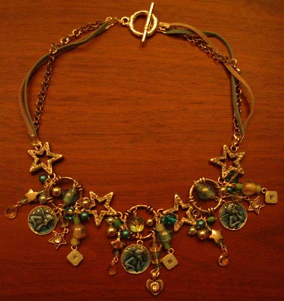 16 jaar | Bij het thema kerst dacht ik gelijk aan een kettig voor een mooie avondjurk. Deze past daar dan ook heel mooi bij. Hij is gemaakt van suede koort, ornamenten en glaskralen. Ik hoop dat jullie hem ook mooi vinden. |