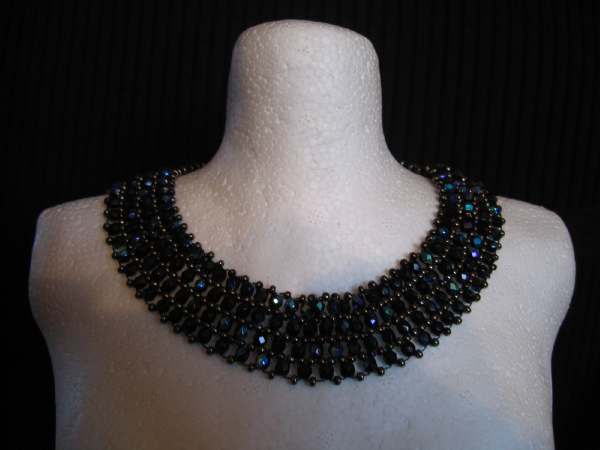 36 jaar | Ik draag hier een ketting die gemaakt is van zwart plexiglas die ik uitgezaagt heb in een driehoek met uitgezaagde twee kleine driehoekjes. de groote driehoek heb ik in verschillende ruiten uitgefreesd. Daarna heb ik in drie ruitjes heel veel 0,50 mm gaatjes zitten boren om met perlonfaden van 0,40 mm draad in verschilende soorten lengtes met een klein rocaille kraaaltje op het uiteinde vast geknoopt de draad heb ik aan de achterkant van het plexiglas laten smelten met een gasaansteker zodat hij mooi glad is zodat hij niet gaat kriebelen tegen je huid.